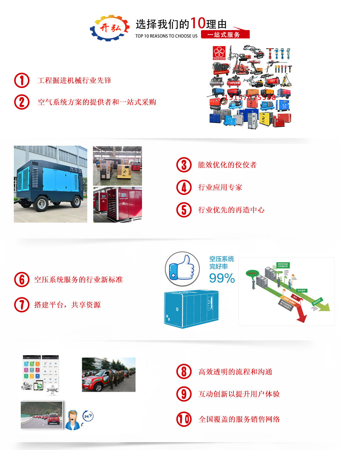 ? ? ? ? 我公司始終堅(jiān)持紅五環(huán)經(jīng)營(yíng)戰(zhàn)略,堅(jiān)持中高端品牌空壓機(jī)、鉆機(jī)的經(jīng)營(yíng)發(fā)展思路 ,專(zhuān)業(yè)于品牌空壓機(jī)、鉆機(jī)的銷(xiāo)售與維修服務(wù),并提供空壓機(jī)、鉆機(jī)維修及零備件供應(yīng)(鉆桿,鉆頭,沖擊器等鉆機(jī)配件;空氣濾芯、機(jī)油濾芯、油氣分離器、專(zhuān)用潤(rùn)滑油、冷卻液……