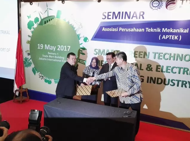 今天上午,主辦方又與印尼機電工程協(xié)會聯(lián)合舉辦了題為“機電工程領(lǐng)域中的綠色智能技術(shù)”的論壇。論壇上,印尼機電工程協(xié)會-機電商會與中國通用機械工業(yè)協(xié)會簽署了合作計劃,蘇永強會長向各位來賓綜合介紹了“中國制造2025”的重要意義。上海漢鐘精機股份有限公司也在今天的論壇上隆重推薦了永磁智能控制系統(tǒng)技術(shù)。