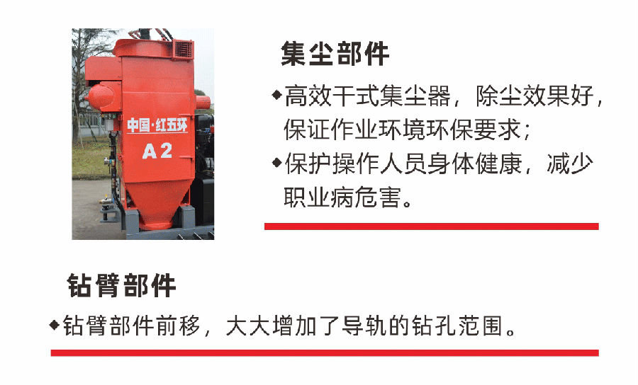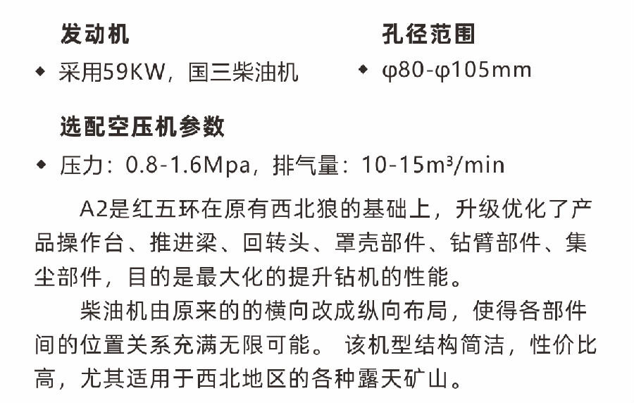 A2是紅五環(huán)在原有西北狼的基礎(chǔ)上,升級優(yōu)化了產(chǎn)品操作臺、推進(jìn)梁、回轉(zhuǎn)頭、罩殼部件、鉆臂部件、集塵部件,目的是最大化的提升鉆機(jī)的性能。柴油機(jī)由原來的的橫向改成縱向布局,使得各部件間的位置關(guān)系充滿無限可能。 該機(jī)型結(jié)構(gòu)簡潔,性價(jià)比高,尤其適用于西北地區(qū)的各種露天礦山。