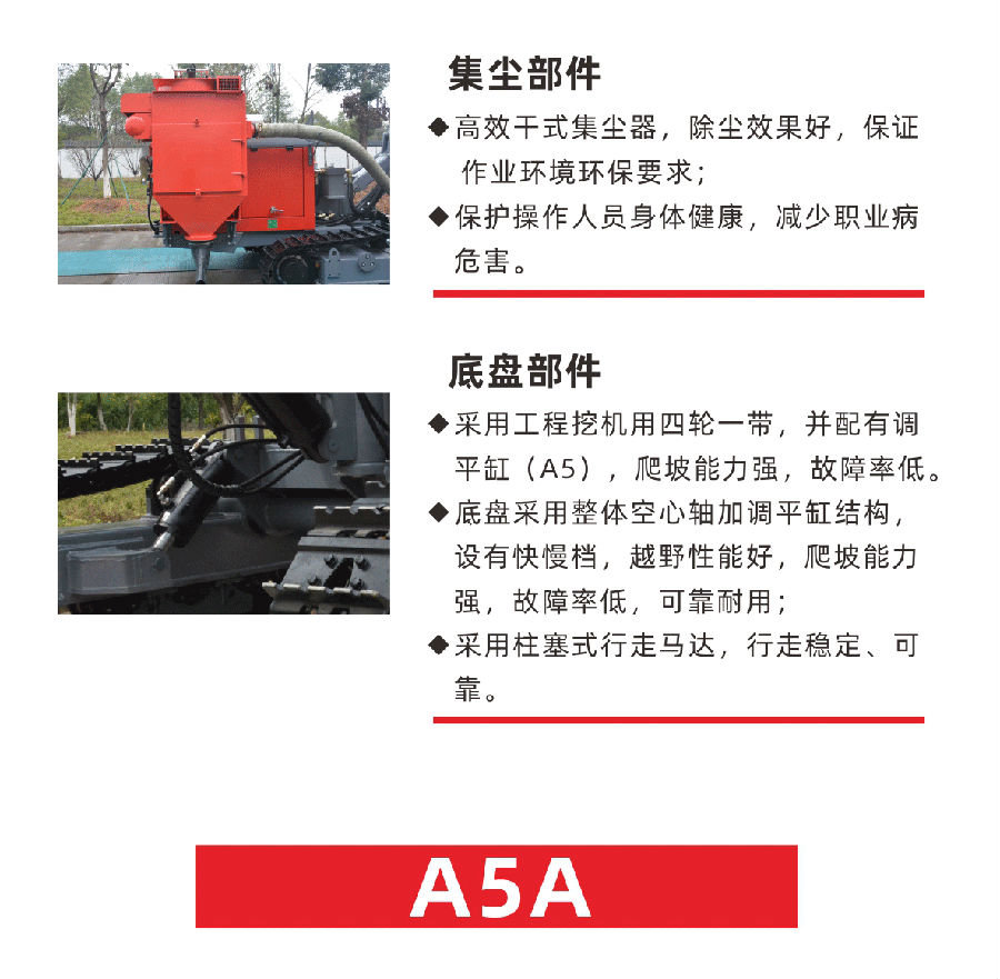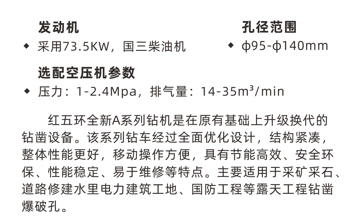 紅五環(huán)全新A系列鉆機(jī)是在原有基礎(chǔ)上升級(jí)換代的鉆鑿設(shè)備。該系列鉆車經(jīng)過全面優(yōu)化設(shè)計(jì),結(jié)構(gòu)緊湊,整體性能更好,移動(dòng)操作方便,具有節(jié)能高效、安全環(huán)保、性能穩(wěn)定、易于維修等特點(diǎn)。主要適用于采礦采石、道路修建水里電力建筑工地、國防工程等露天工程鉆鑿爆破孔。
