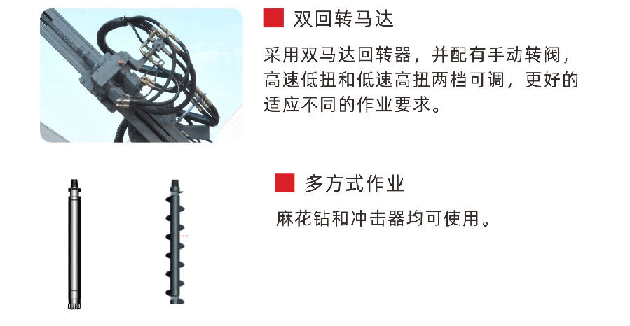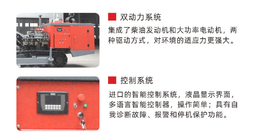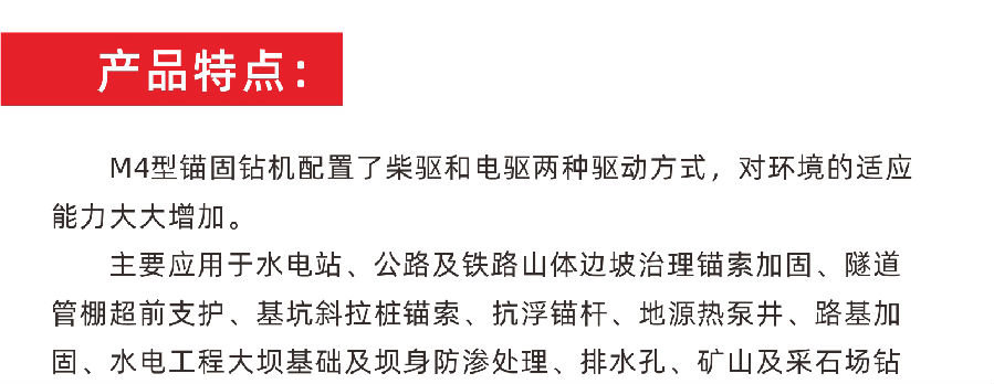 M4型錨固鉆機(jī)配置了柴驅(qū)和電驅(qū)兩種驅(qū)動(dòng)方式,對(duì)環(huán)境的適應(yīng)能力大大增加。主要應(yīng)用于水電站、公路及鐵路山體邊坡治理錨索加固、隧道管棚超前支護(hù)、基坑斜拉樁錨索、抗浮錨桿、地源熱泵井、路基加固、水電工程大壩基礎(chǔ)及壩身防滲處理、排水孔、礦山及采石場(chǎng)鉆孔、微型樁孔等工程。