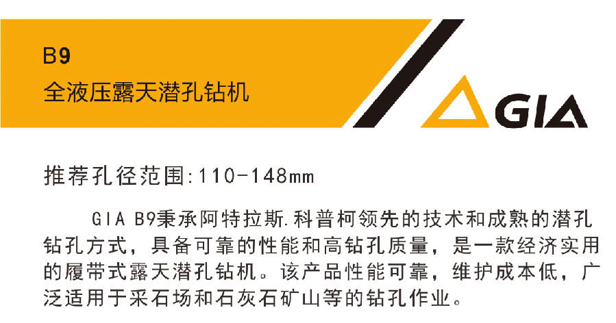 推薦孔徑范圍:110-148mmGIA B9秉承阿特拉斯.科普柯領(lǐng)先的技術(shù)和成熟的潛孔鉆孔方式,具備可靠的性能和高鉆孔質(zhì)量,是一款經(jīng)濟(jì)實(shí)用的履帶式露天潛孔鉆機(jī)。該產(chǎn)品性能可靠,維護(hù)成本低,廣泛適用于采石場和石灰石礦山等的鉆孔作業(yè)。