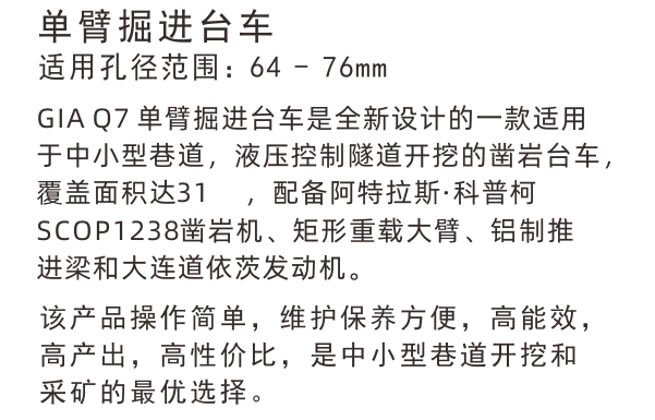 GIA Q7 單臂掘進(jìn)臺車是全新設(shè)計的一款適用于中小型巷道,液壓控制隧道開挖的鑿巖臺車,覆蓋面積達(dá)31 ,配備阿特拉斯·科普柯SCOP1238鑿巖機(jī)、矩形重載大臂、鋁制推進(jìn)梁和大連道依茨發(fā)動機(jī)。該產(chǎn)品操作簡單,維護(hù)保養(yǎng)方便,高能效,高產(chǎn)出,高性價比,是中小型巷道開挖和采礦的最優(yōu)選擇。